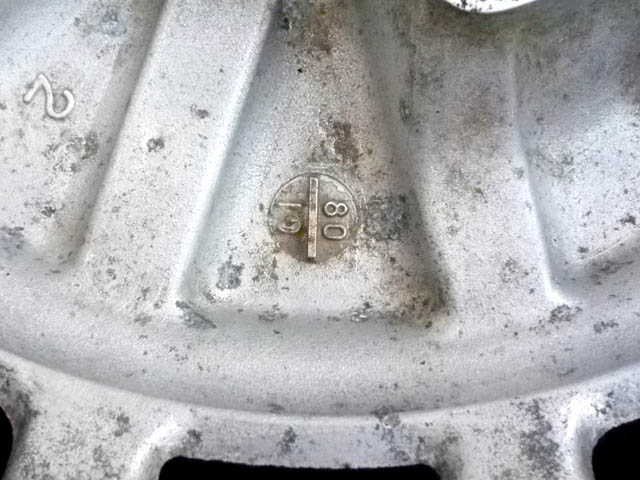 | 取りあえず、一番状態の良いホイールの表側を修正してみることにいたしました。 そう修正する必要はない(裏側は、無修正)のですが、痘痕のできた所に、J-Bウエルドを薄く塗り込みます。 この時点で、作業の邪魔になる、ゴムパッキンの劣化したエアヴァルヴを外しておきます。 |