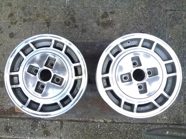 | また年末に、ヤフオクでホイールを買いこみました。 こちらの探しているサイズのホイールが、前からヤフオクに出品されていることは知っていたのですが、デザイン的にはギリギリ合格という程度です。そこで、もっとベレットに合うホイールが出品されないか見守っていたのですが、足回りの完成を急ぎたいので、とうとう落札してしまいました。 14インチ×5.5J、オフセット+35mm、P.C.Dは当然114.3mmになります。 |