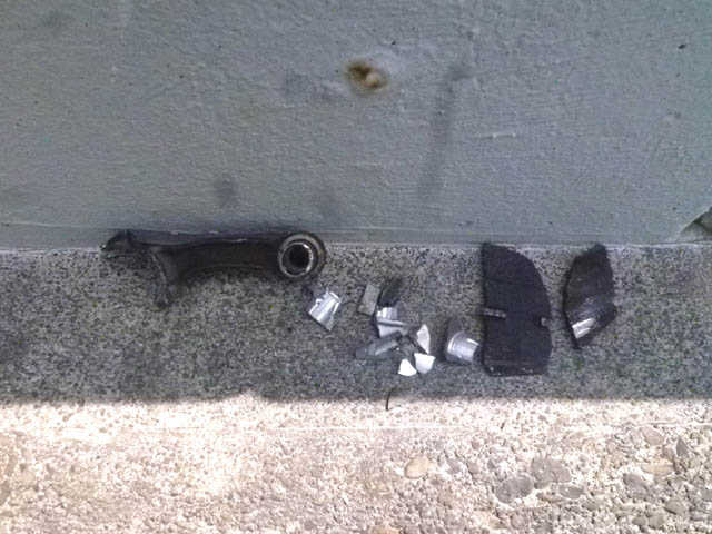 | 破損したコンロッドが、ブロックの側面を突き抜けたようで、大きく割れてます。細かく砕け散ったアルミ部品は、ピストンのスカート部分? コンロッド破