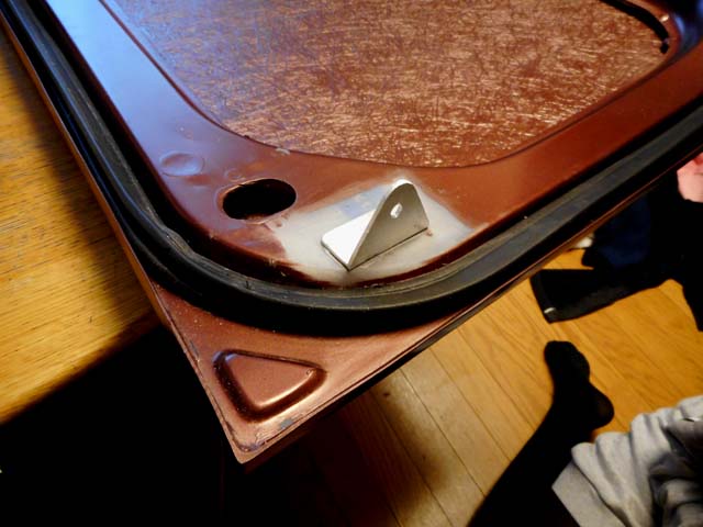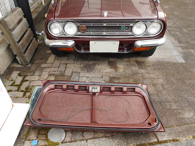 | トランクフードは、確かシティーオート製のFRPのものを取り付けていた(と思う?)のですが、去年自動車屋さんに預けている時のトラブルで、現在はリスタードのものに付け替えられています(^^;;。リスタードのものは、軽量化重視なのか、シティーオートのものに比べると、薄く柔い感じです。 このリスタードのものは、ストッパーを固定する為のステーが埋め込まれていないようです。しかし、ストッパーがないと不便なので、フードにストッパー用のステーを追加することにいたします。 まずは、前のベレットに付けていたとおぼしき純正品のトランクフードで、ストッパーの取り付けステーの取り付け位置やサイズを測定します。 |