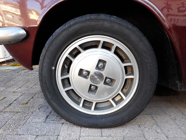 | 現在ベレットには、ヤフオクで購入した910ブルーバードの純正アルミホイールを、(インチキ修理して)履かせております。FR用にしてはオフセットの値が大きいので、車幅が狭く、太いホイールの履けないベレットとの相性は良いのですが、購入時センターキャップは付いておりませんでした。 |