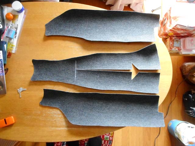 | カーぺットの変形・縮みを考慮しても明らかに左右対称ではなかったようです。ミッションの形が左右対称ではなく、センタートンネルのこの部分も、ミッションの形状を反映しているものの思われます。 注文していたカーペットが届きましたが、期待していたものと全く違っていた。固いです。奥様の家庭用ミシンで2枚重ねて縫い合わせできるかどうか試してもらったのですが、速いスピードで縫っていけば縫えるものの、直線的でもなく、合わせたところが完全に平面でもないものを、速いスピードで一気縫いするのは、ちょっと難しいようです。 |