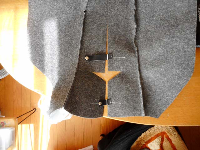 | 前方の左右に分かれた部分を繋ぐバンドはオリヂナルと同じく、ドアポケットやサイドブレーキカバーを作るときに使ったビニールレザーの残りを使用し、接続用の15mm径のジャンバーホックを打ち込んだ後、 |