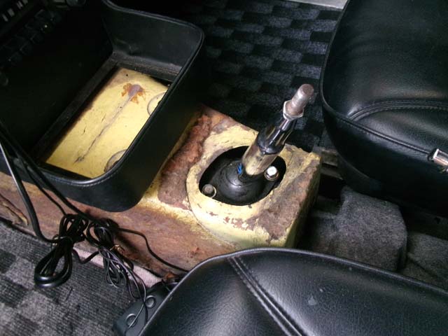 | まずシフトノブとシフトレバーのゴムカバーを取り外して、カーペットのシフトレバーの通るあたりに30o径の穴を開けます。 トンネル側の穴は円かと思ったら、角の丸まった菱形っぽい形でした。 |