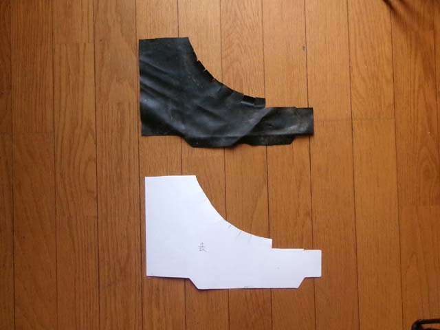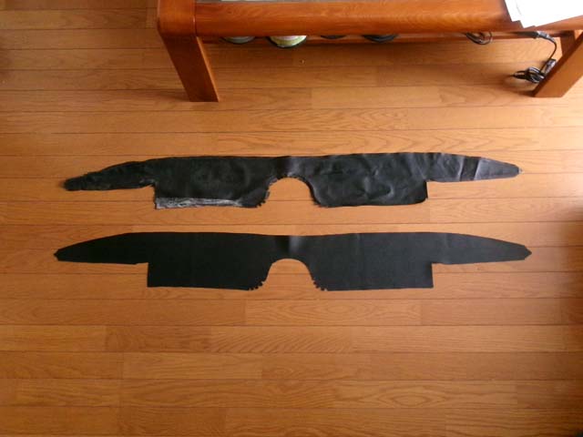 | 後席下の上の部分を切り抜き。やっぱり柔らかくて撓りやすいレザーの大きいパーツは、カッターよりも奥さまの裁縫鋏を使った方が綺麗に切れます。 |