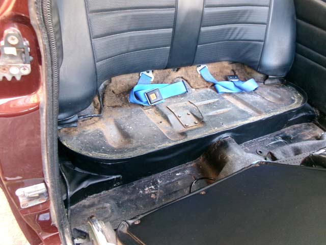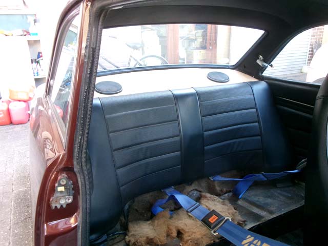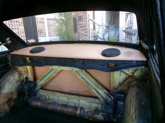 | 残っている後席の右側脇と、前面の下の方の二枚を剥がしました。 まず後席の左右の脇と後席背もたれのフック部分、リアガラスの下から、新しく切ったレザーを貼っていきます。 |