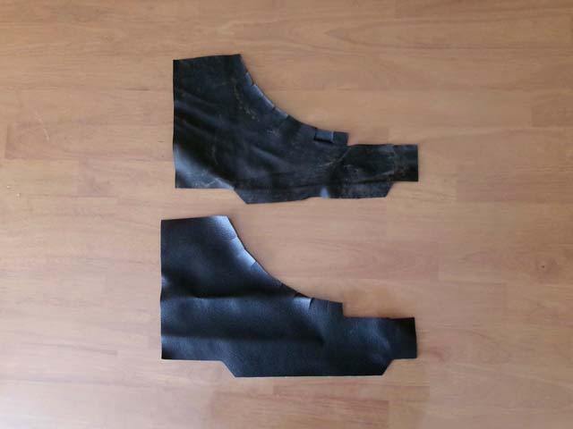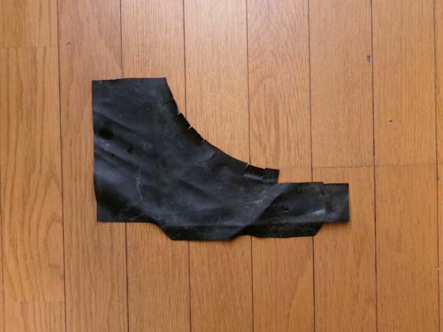 | 後席下の下の部分を切り抜き。こちらは縁を折り返して取り付けなければいけない部分が多いのですが、元のレザーを見ると上部以外は、折り返す内側に接着剤が入っていた形跡はありません。貼り付ける両面に接着剤を塗る必要のあるG17ボンド(スプレーのり99も同じですが)で、現物合わせで折り返してうまく外側だけで貼り付けできる自信がないので、折り返し部分はあらかじめ接着して縁の形を固定しておきます。 |