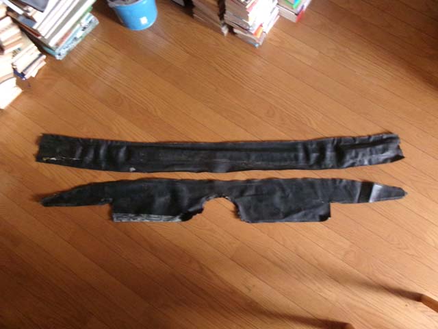 | この大きいビニールレザーはよく判らないのですが、シートベルトの通りそうな個所に切れ目が入っているので、後席の裏あたりでしょうか? リアガラスの下部分以外のレザーは再使用できそうですが、この際全て新しく作って、貼り直しておきたいと思います。 レザーの表面を清掃し、裏からアイロンをかけ、上から重しをして折れや縒れをなるべく伸ばし、 |