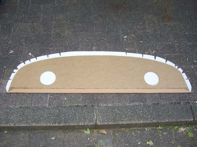 | ハードボードを二枚買って、トランクボードやトランク仕切りボード、運転席と助手席の足元のサイドボードを作り直したのですが、まだ余っていたので、リアトレイボードも作り直すことにしました。オリヂナルよりも厚い3.5mmのボードを使用しています。 オリヂナルのボードで型を取って、引廻鋸で切り抜きます。上からビニールレザーを貼る為、そう切断面の綺麗さに拘る必要はありませんので、10分くらいの作業です。角の部分は、カッターで大雑把に押し切りしてRをだし、鑢で整えます。 |