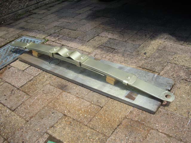 | Yahoo!オークションで、リーフ・スプリングを購入しました。 フロントの足回りを今年中に90%くらいは完成させるつもりですので、来年から取り組む予定のリアの足回りの為の準備です(後ろは、レストア中の燃料タンク)。 |
