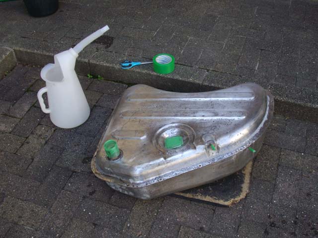 | 「今日は多分、晴れるだろう」と予想して、店を開く前に、燃料タンクの錆取りをやっておくことにしました。 以前から錆取りで使用しているRSR-2の原液を2本投入。縦にしたり、横にしたり、引っ繰り返したり、振ったりしていると、流石に塗装の養生用テープで塞いだところから、錆取り剤が少しずつ漏れてきます。それでも振り回していたら、「げぇ!」漏れてはいけない側面からも漏れている。 錆をこれでもかっ!といくらい削って、貫通穴を全て確認し、ハンダで(13〜14個は)埋めたはずなのですが、どうもひとつ(浅い痘痕程度に思って)見 落としていたようです。先日タンクの洗浄がてら確認した時はこんな漏れはなかったのですが、錆が溶けることによって完全に貫通してしまったようで、次第に 漏れがひどくなってきました(^^;;。内部のコーディングの前に見つかってよかったです。 一時間ちょっと振り回した後、錆取り剤を抜き(再使用可能な為、濾して取っておきます)、水を満水にして洗い流す作業を5〜6回繰り返した後、錆び止め 中和剤のER-G3000を400mlの水で希釈して投入。10分くらい振り回して、タンク全体に行き渡らせた後、廃棄しました。 |