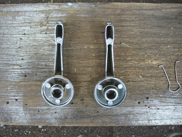 | 嵌めてみました。右がオリヂナル、左が今回製作のものです。オリヂナルよりも太いので、ギリギリ嵌まることは嵌るのですが、きもいです。外す時に、ちょっと手こずる可能性はあります。 二個作って、両側とも取り替えようかと思っていたのですが、使い勝手が判らないので、とりあえず一個だけにしておきます。10分程度の作業です。これで、左右のドア内張の取り付けは、問題なくできます。 ドアポケットの完成している、運転席側の内張を取り付けにかかります。 |
