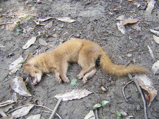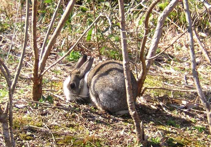 2003年の暮れくらいから姿を見せるようになった。体毛からしてノウサギではなくてアナウサギ、耳の長さが短いことから、ペットショップで売られているミニウサギを、誰かが放したものだと思う。猪高緑地のアイドルだ。