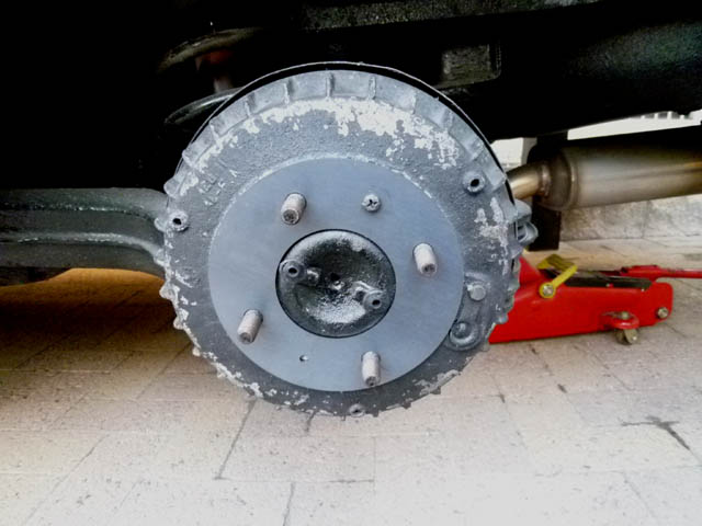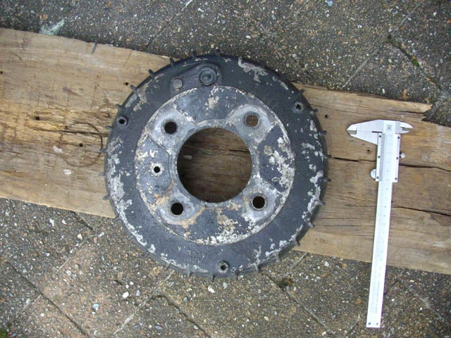 | みんカラの、Gizinさんとこのブログで、リアのブレーキには元々ドラムプレートが付いていたことを識りました。エンジンのオーヴァーホール用のパーツをいすゞに頼む時に訊いてみたのですが、これはもう出ないとのことです。当然プレートの現物はない為、ドラムの蓋で、必要なサイズを測定してみました。 |