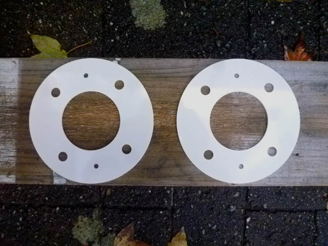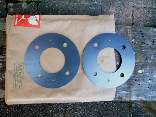| スペーサーを兼ねて、純正の1.2mmではなくて、2.3mm厚のクロカワの鉄板で製作してももらいました。 現在履いている、14インチ×5.5J、オフセット25改+28のホイールに使うのは、タイヤとフェンダーのクリアランスがギリギリ過ぎて無理です。オフセットが+34か+35のホイールと組み合わせて使うことを想定しています。 |