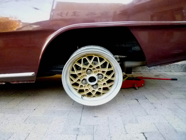 | プレートの上に、+35のマグホイールを履かせてみました。今までより4.7mm奥にへ引っ込みますが、内側に干渉しそうなところもなく、リアに関しては問題有りません。 インターネットで色々と検索してみたのですが、クロカワの防錆性能程度では、屋外でそのまま使用するのは無理そうです。黒皮被膜の上からクリヤーを吹いて、クロカワの風合いを活かすというのも、耐久性の面で難しそうです。 ここは諦めて、鉄板の表面を180番から400番のサンドペーパーで磨き、リアスプリングに使った、三菱系の白で塗装してみました。 |