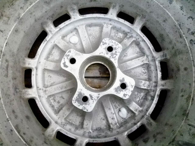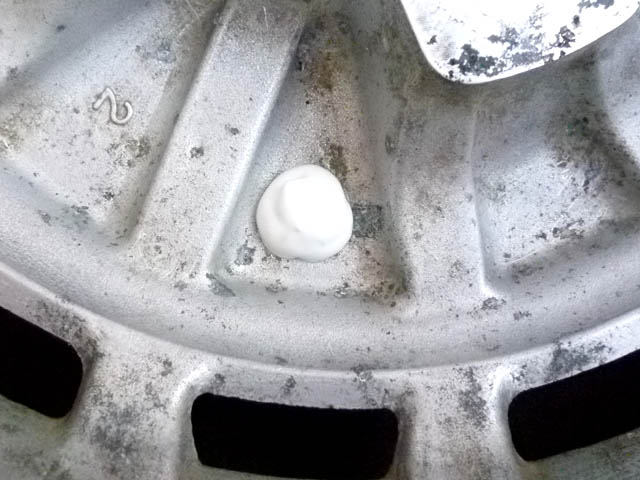 | 取りあえず、一番状態の良いホイールの表側を修正してみることにいたしました。 そう修正する必要はない(裏側は、無修正)のですが、痘痕のできた所に、J-Bウエルドを薄く塗り込みます。 この時点で、作業の邪魔になる、ゴムパッキンの劣化したエアヴァルヴを外しておきます。 |
