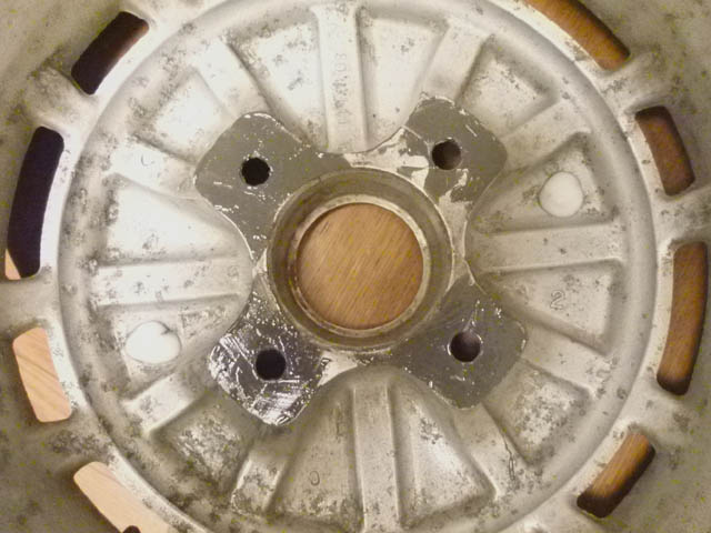| ドラムプレートと接するセンター部分の痘痕になった部分(とついでにリム部分の疵)は、J-Bウエルドで埋めておきます。 |