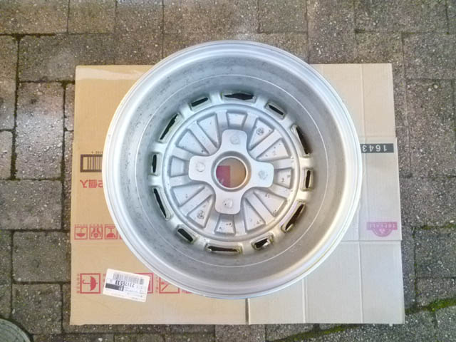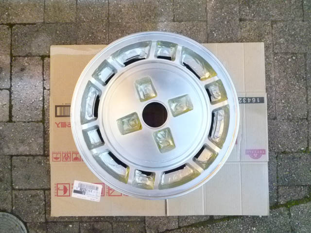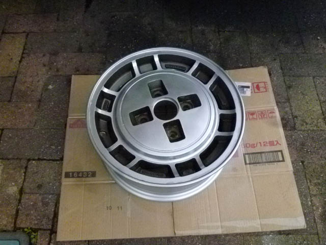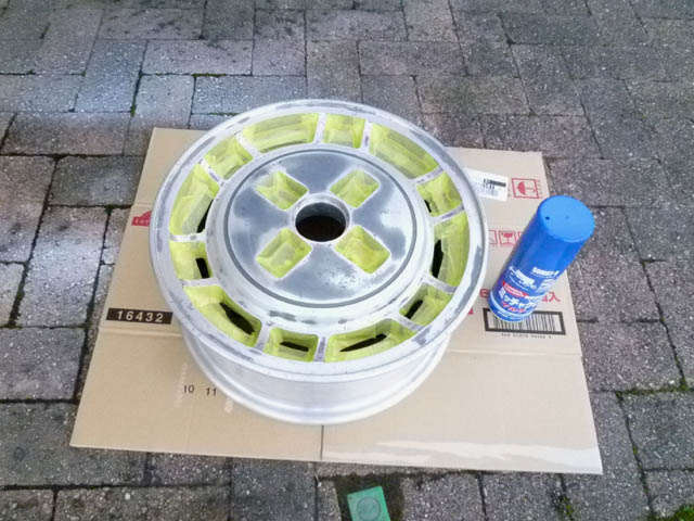 | ホイールシルバーを吹いておいた2本目のホイールも、クリアを上塗りしました。このホイールだけ、裏側に目立った腐食はなかったので、綺麗な仕上がりになりました。 あと2本ですが、ちょこっと忙しいので、塗装の完了まで、まだ日数がかかりそうです。 4本塗装しようと思うと、ホイールシルバーとクリアのスプレー塗料が、3本ずつ必要なようです。また買ってこないと。 |