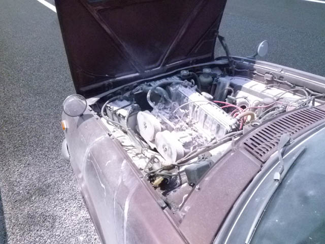 | 1800GTの貴重な前期型エンジンがご臨終です。 ベレットのトランクに、息子が大学の部 活で使う資材を積み込んで、息子と一緒に、四日市大学まで運ぶことにしました。高針インターから名古屋高速に乗り、東名阪自動車道の名古屋西料金所まで は、順調に(気持ちの良いスピードで)とばしていたのですが、料金所で通行券を取るために停止したところ、何故かエンスト。あれっ? エンジンの再始動ま で少々手間取りました。 東名阪に入って、名古屋高速でも多少気になっていたエンジンルームからのパタパタという異音(久々の高速走行で、かなり慎重に水温・油圧・音をチェック しています)が、かなり大きくなってきました(去年作ったヒートプレートの固定螺子の緩み・ばたつき?)。高速では余程のことがないと停車できないので、 高速を降りるまでと思って、左車線を前の車に付いてゆっくり気味に走っていたのですが、突然パぁーンという破裂音がして、砕け散った部品が後方に飛び散る のが見えました。 すぐに路肩に寄り停止したのですが、ボンネットの隙間から煙が上がっています。ボンネットを開けると、キャブより下の部分から火が出ているようです。 幸いにも、三四台後方にNEXCO中日本さんの作業車が走っており、後ろに止まっていただけたので、消火をお願いしました。 |