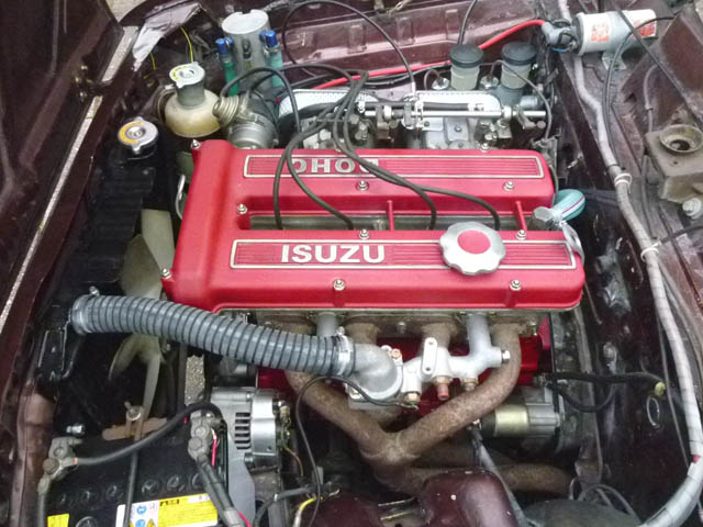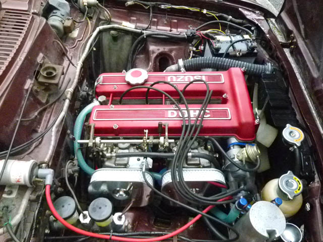 | キャブは、ブローしたエンジンで使っていたSOLEXのφ44、エキマニは117クーペのものを加工して使用しています。プラグコードは交換する予定です。 ベレット2000GT-typeRに似合うのは、やはりSOLEXですね。 最低限の希望を出した他は、ほとんどお任せだったのですが、流石FIXさん、ノーマルっぽいエンジンルームの雰囲気に拘る、私の趣味が判っていらっしゃる(^_^)。特にファンを、電動ファンに代えずに、そのまま使用していただいたのはグッドです。 |