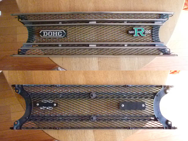 | 一応グリルを水洗いして、新に「DOHC」と、本来は両サイドフェンダーに付いている「typeR」のエンブレムを取り付けます。傾かないように取り付けようとすると、取付位置が意外と思い通りになりません。裏側から、当て板をし、3mmのブッシュナットで「DOHC」の方から固定します。「typeR」の方は、ボッチの径が2.9mmしかなく、ナットが利かないので、金槌でナットを叩いて開口部を狭めてから差し込みました。これで大丈夫なはずですが、念のためにボッチの周りをボンドで固めておきました。 |