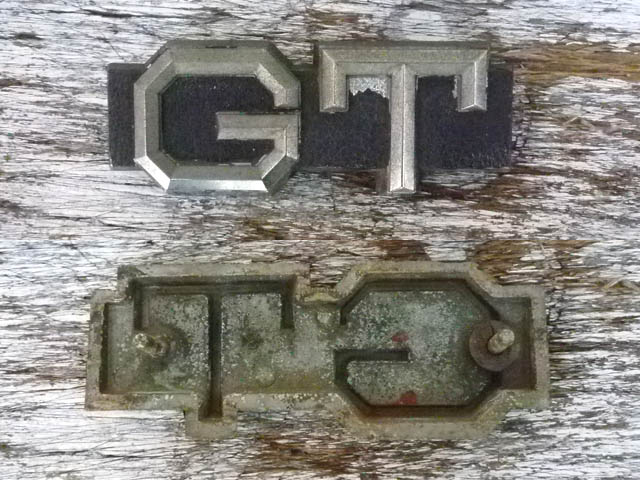| 車を買ったときから、グリルの「GT」エンブレムが少し傾いているのが、気になっていました。外して裏側から見ると、小さい留め金具2個で固定されています。どうも最初の取付作業が杜撰だったような感じです。 留め金具をニッパーで切って、ボッチ部分を破損することなく、取り外すことができました。 |
