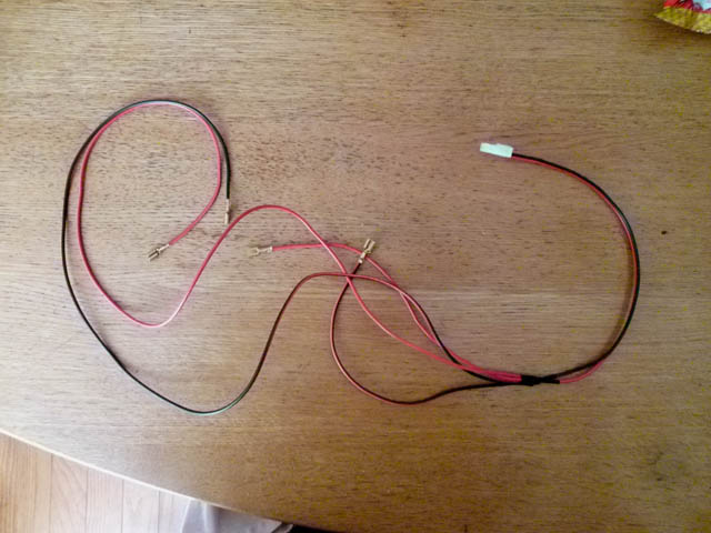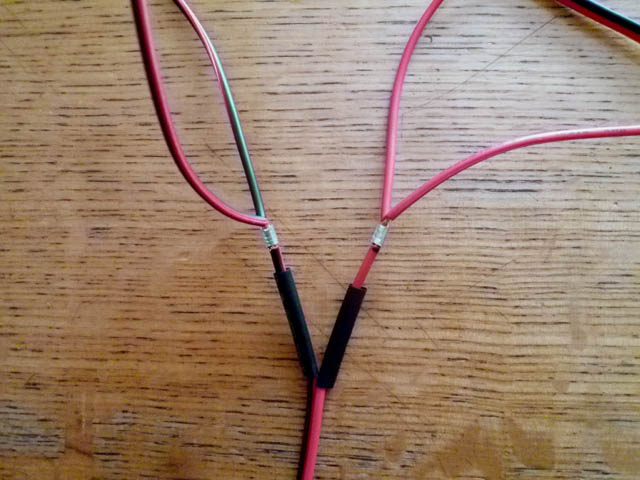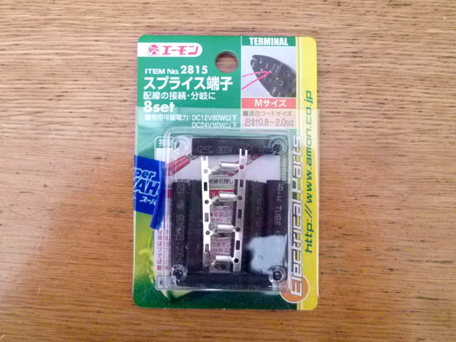 | 配線の分岐は、長い方のケーブルの途中の被膜を剥いで、短いケーブルの端の銅線を巻き付け、スプライス端子を使用して、かしめます。一緒に入っていた黒いのは、熱収縮チューブかと思います。差し込んでおいて、後日分岐箇所の絶縁に使用します。 |