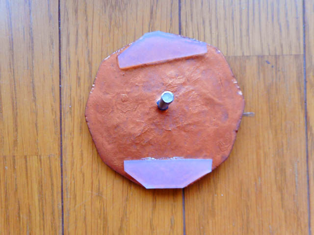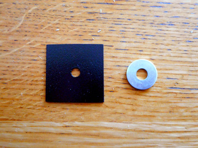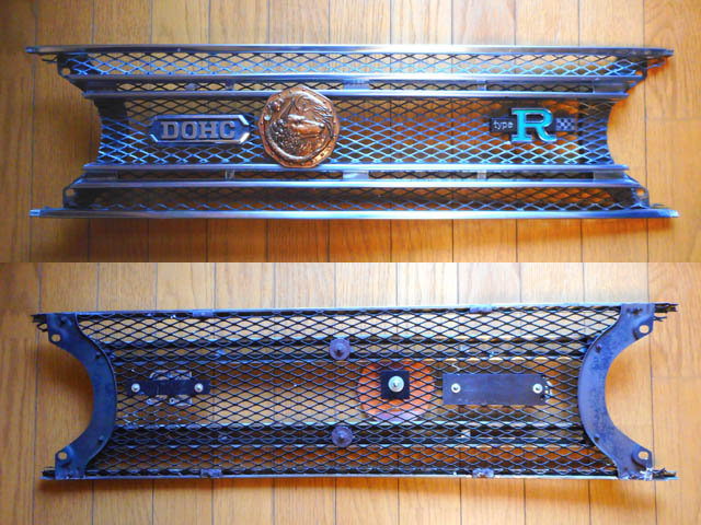 | まあ、良い感じに仕上がったようです。 一晩寝かせて、黒さびが定着したら、クリア塗装を吹きます。 バッヂの取り付けは、当初はバッヂとグリルの網の間にスペーサーを挟んで、ボルトの前後で位置決めをするように考えていたのですが、実際グリルに差し込んでみて、「そこまでする必要はないだろう」ということで、後側はグリルの裏側に付属のワッシャーよりも広い面積で押さえられるように、1mm厚の鉄板で留め板を作りました。 |