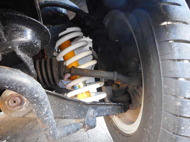 | 基本的に市販車と競技車の中間くらいの、運転していて楽しい車を目指していますので、オリヂナルの足をそのまま活かして、性能を上げていく方向です。普通コーナリング性能を上げる為には、より固く短いスプリングを入れるのが普通ですが、どう考えてもベレット1800GTのフロントは固すぎるので、車高は変えないまま、●線径:14mm ●内径:91mm ●9.4巻 ●自由長:325mm ●レート:4.5kgf/mm ●密着長:124mmの特注のスプリングを入れました。ノーマルより柔らかくストロークの長いスプリングを入れることで、高速コーナーで、よりしなやかなコーナリングを目指します。元々固すぎるノーマルよりも、更に固く短くしてどうするんだ、という考えです。 |