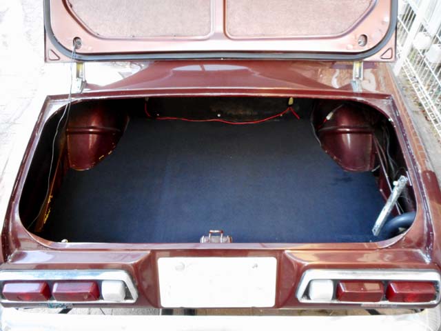 | トランクカーペットは、今のベレットを買った時に、縮んだり傷んではいるものの、一応付いていたのですが、汚いので洗濯機に入れてみたら、再起不能になりました(^^;;。そこでトランクの型を取って、市販のカーペットを切って作ってみたのですが、生地が厚いのと、あまりに精度を追及してきちきちに作ってしまったので、捲るのがかなり面倒です。 |