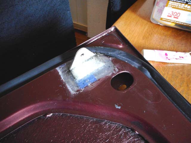 | くっつけたステーの周りの塗料を更に削って、上からポリ樹脂でガラス繊維のシートを貼り込み、補強します。ガラス繊維は2枚重ねました。 |