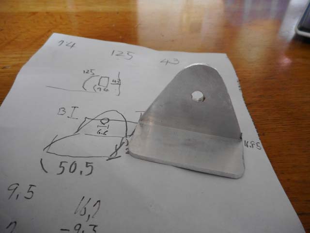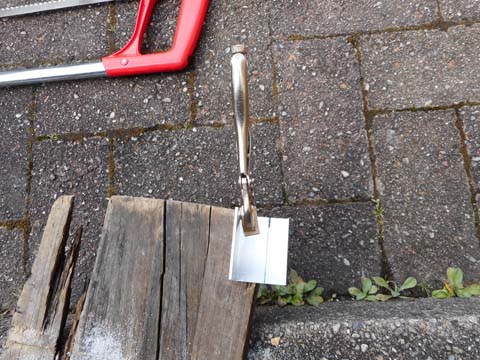 | 金鋸でカットして、これで螺子の通る穴を開けたら完成、ということでもいいのですが、どうせなのでオリヂナルに近い形に成形します。 |