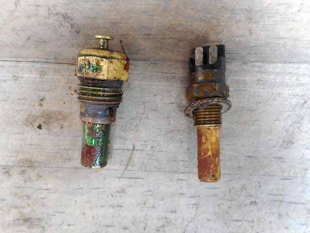 | 理想的な形状のウォーターアウトレットが見つかったので、まだ完全な道筋が見えないものの、俄然やる気が出てまいりました。 そのウォーターアウトレットですが、水温センサーらしきものが2本刺さっていました。右側のは何に使っていたんだろうな? |