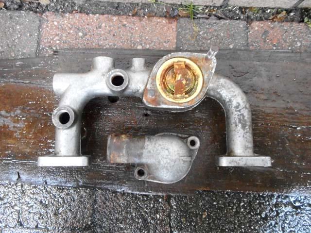 | 簡単に外せると思っていたウォーターアウトレットのサーモスタットのハウジングですが、ボルト部分で強烈に固着しているようで、金鎚で叩いたり、サーモの口にパイプを入れて、パッキンが剥がれる程度に持ちあがらないかやってみたのですが、ビクともいたしません。ボルト部分を冷やしたり焼いたり、更に叩いたり、パッキンの部分にスクレイパーを打ち込んだりしたのですが、全く緩む気配がありません。流石にこれ以上無茶をするとやばいのではないかと思い、行きつけの自動車屋さんに相談することにしました。 作業としてはやはり、バーナーでボルトを焼いて膨張させ、叩いて振動を与え、スクレイパーを打ち込みの繰り返しですが、一向に緩む気配が有りません。そのうちに叩いている音が変わり、「片側は浮いた」とのこと。もう一方が緩むまでには更に時間を要した(総作業時間で40分くらいか)のですが、無事外していただくことができました。ボルトのネジ山も修正していただきました。 自動車屋さんも「壊れずに良かった」という程の作業でしたので、ぎりぎりの力加減の判らない素人が、一か八かでやってみる作業ではなかったです。 |