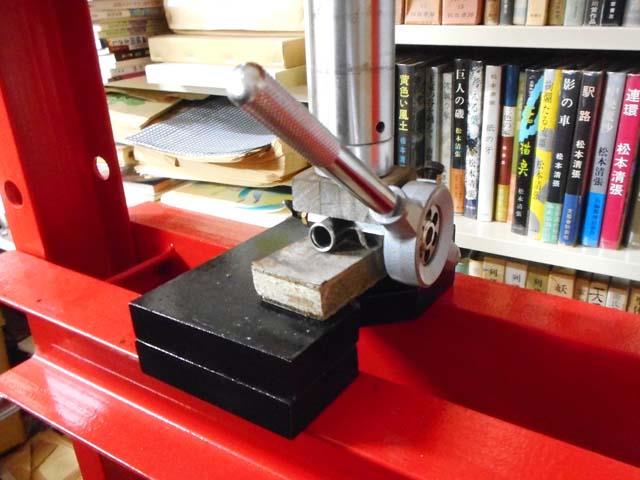 | 万力がないので、プレスでヒーターコックを固定しますが、これだとダイスを縦にセットして切ることになり、ダイスハンドルの棒がプレスに引っかかって回転させることができません。 |