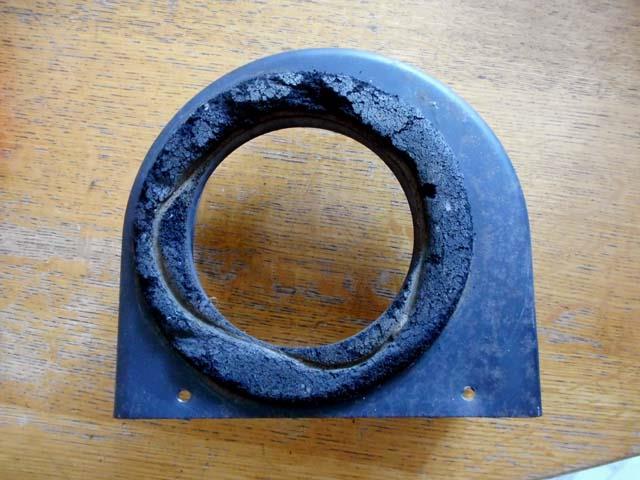 | ヒーターのこちらのゴムは完全に劣化しているので取り換えておきたい。サイズ的には、内径100mm、外径144mm、厚みが10mmくらいか。スボンジのようなボソボソとしたゴムです。 |