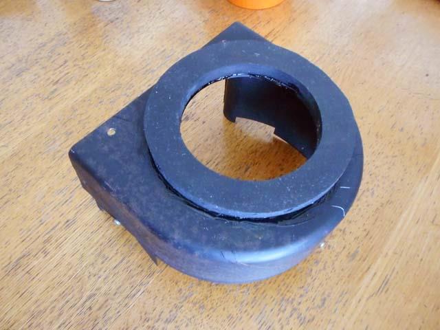 | 天然ゴム板をサークルカッターで切って、スーパーXGで貼り付けました。 追伸: この部分を固いゴムに替えたのは、結果的に大失敗だったことが、ダクトの取り付けの時に判明いたします。 |