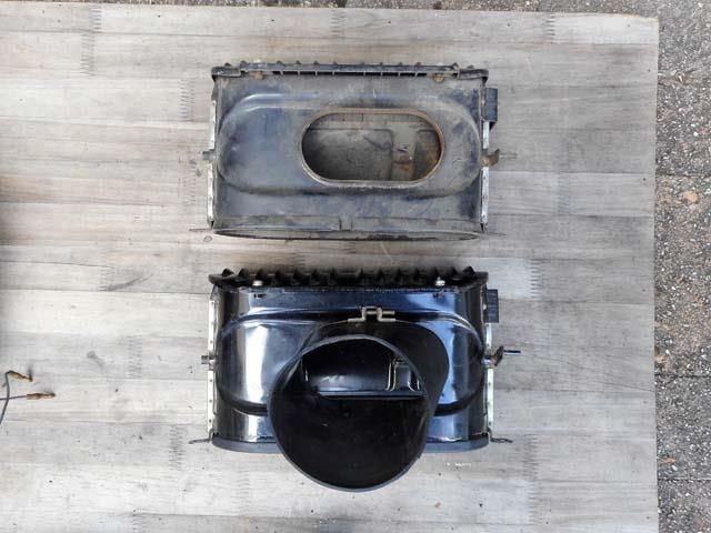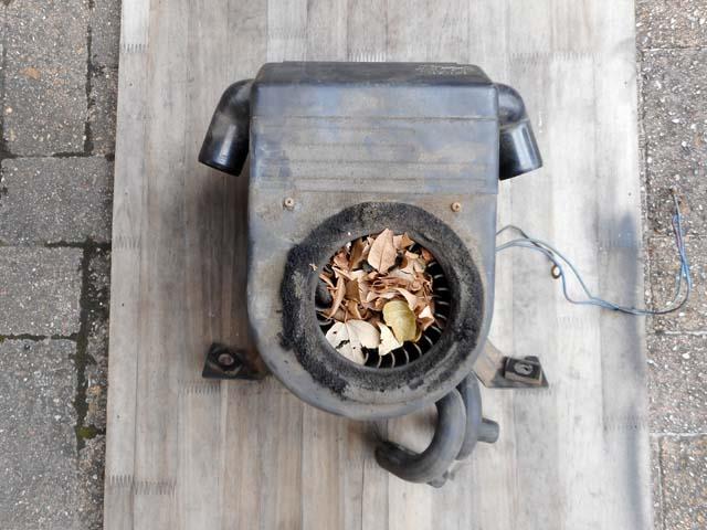 | 定休日の今日は、午前中にベレットのヒーターとエアダクトの取り換えまでやってしまおうと思ったのですが、今まで付いていたヒーターを外したところ、げっ、外気と一緒に吸い込んだ枯れ葉が溜まって、ゴミ箱状態になっていました。 |