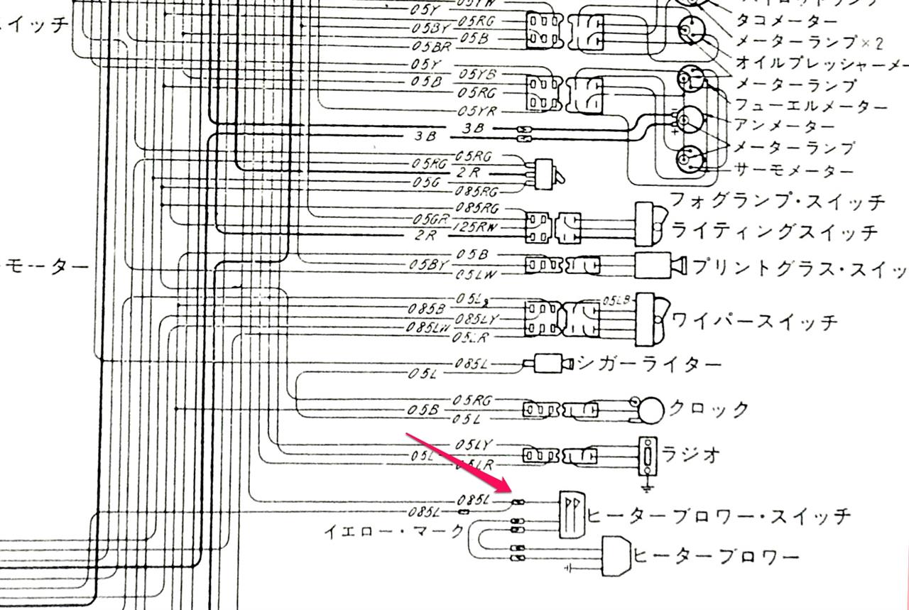 | ヒーターとの間のゴムは、新しく取り付けるエアダクトに移植します。 ヒーターの上のスポンジは、何の為のものか不明だったのですが、まずヒーターを取り付けて、上部にエアダクトを取り付けると、ゴムがヒーターのスポンジを押さえつけて、空気漏れを防ぐことになるようです。 柔らかいスポンジのままだった方が、エアダクトの螺子穴の位置出しが、多少楽だったかもしれない。 ヒーターからの配線は、ボディ(−)とヒータースヰッチに繋がっているのですが、ヒータースヰッチからの配線が1本遊んでいます。 配線図を確認すると、 |
