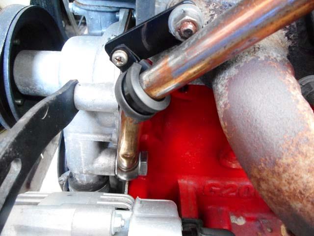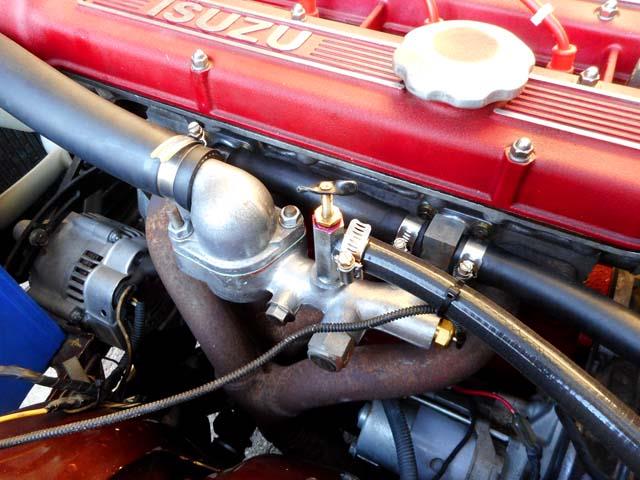 | 現在のエンヂンに載せ換えてから、水温がちょっと低めだったのですが、ウォーターアウトレットを117クーペECの超稀少ものに取り換えたら、正常っぽくなったようです。アウトレットのヒーターコック(汎用品)とヒーターの間は、径の合うゴムホースが見つからなかった為、黒のシリコンホースを奢りました。 |