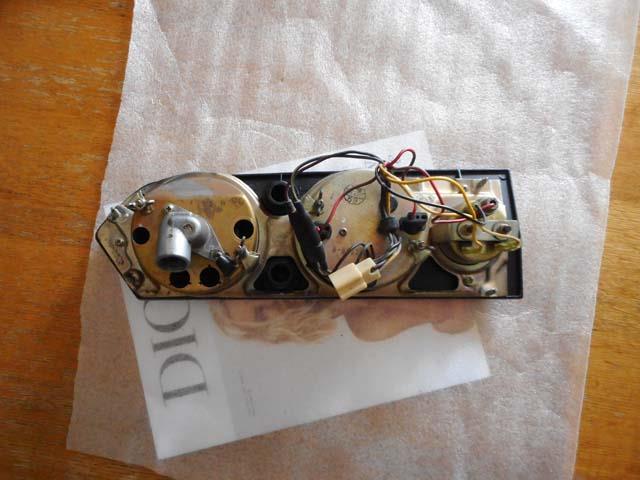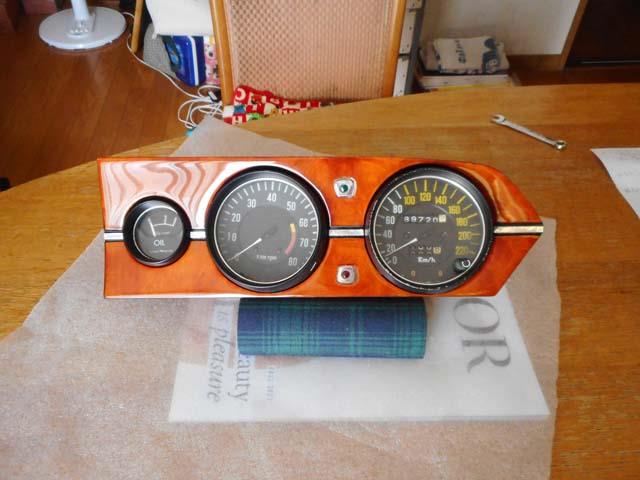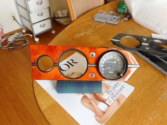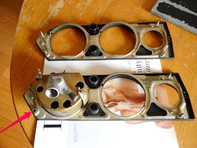 | ツキ板加工に出した方のメーターパネルですが、取り付け螺子が1本消失しているようですので、裏の金属板をベレットから取り外したパネルのものと交換します。 そして、メーターの本取り付け開始。 |