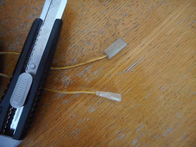 誌に、この抜き取り作業には「段ボール用のホッチキスの針を使うと良い」という記事があった記憶なので、やってみたのですが、やり方が拙いのか、ギボシを抜くことはできませんでした。 同じカプラーも、探せばあるのかもしれないのですが、諦めて、買ってきたキボシとスリーブをサクっと取り付けます。 |