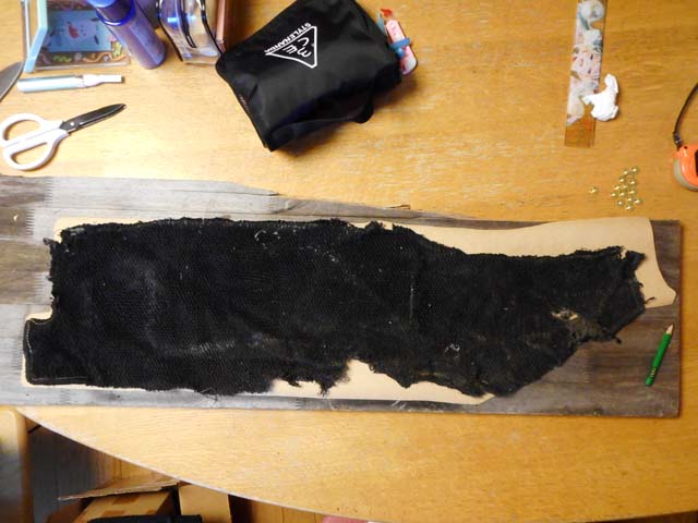 | 前方の左右に分かれた部分を繋ぐバンドはオリヂナルと同じく、ドアポケットやサイドブレーキカバーを作るときに使ったビニールレザーの残りを使用し、接続用の15mm径のジャンバーホックを打ち込んだ後、 |