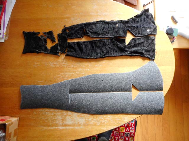 | カーペットが届くまでの間に、保存しておいたオリヂナルのカーペットの縫い目を解いて三つに分けて、型紙を作ります。 |
