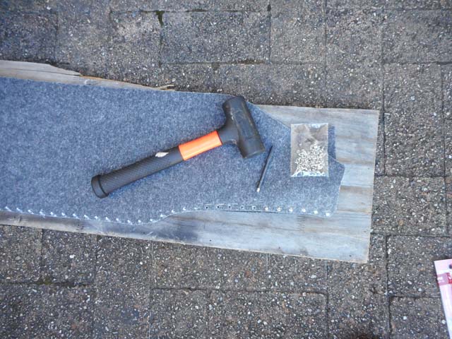 | そこで型に合わせて切ったカーペットをカシメで留めることにしました。 カーペットを二枚合わせた時の厚みは2+2=4mmではなく、ノギスで測ると、ふんわりと押さえて3mm、普通程度に押さえると2mmと、思っていたより薄いです。縫い合わせるには固く、カシメ留めするには薄い、大変やっかいな素材を買ってしまいました。 両面カシメで、足長4mm、頭径6mmのものが見つかったので、これをカーペットの合わせ目に5mmの縁取り、20mmの間隔で、縁を合わせながら順番に打ち込んでいきます。 |