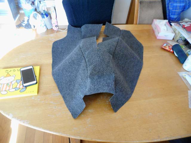 | カーぺットの変形・縮みを考慮しても明らかに左右対称ではなかったようです。ミッションの形が左右対称ではなく、センタートンネルのこの部分も、ミッションの形状を反映しているものの思われます。 注文していたカーペットが届きましたが、期待していたものと全く違っていた。固いです。奥様の家庭用ミシンで2枚重ねて縫い合わせできるかどうか試してもらったのですが、速いスピードで縫っていけば縫えるものの、直線的でもなく、合わせたところが完全に平面でもないものを、速いスピードで一気縫いするのは、ちょっと難しいようです。 |
