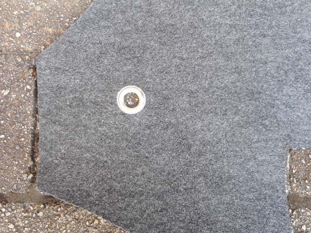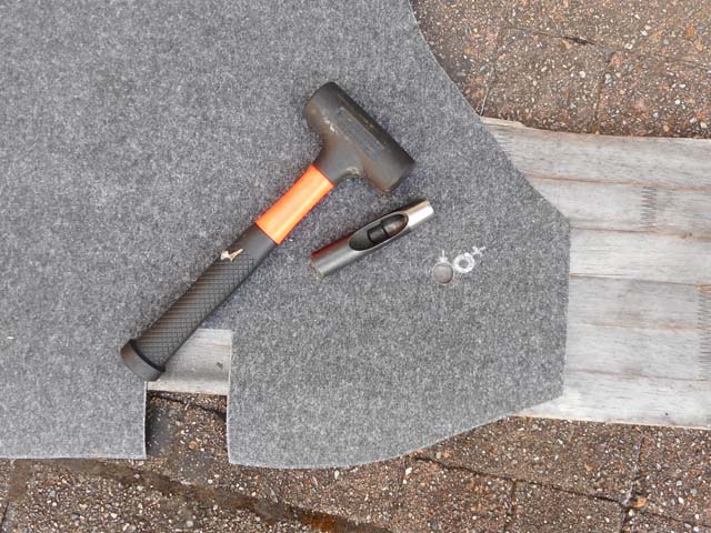 | 32号のハトメを打ち込みます。この薄いカーペットにきちんとハトメが打ち込めるかどうかが一番の問題だったのですが、裏側でリングの一部が裂けました(^^;;。売り物ではないので気にしません。もしかするとトンカチでカンカン叩かず、打ち棒をプレスでじわっと圧してやれば、うまくいったかもしれません。 |