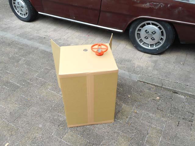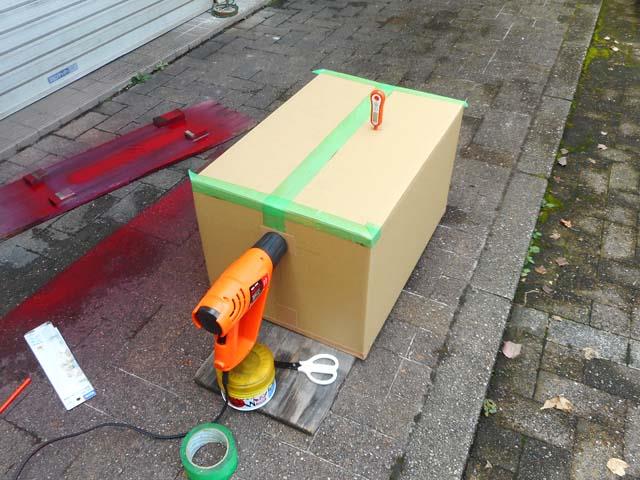 | HPで買ってきたダンボールに、ヒートガンと温度計を差し込む穴、排気用の穴を開けておきます。 |