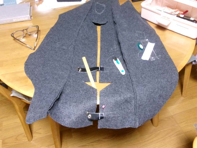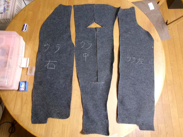 | 奥さまにベルトをフエルト生地にちゃちゃっと縫いつけてもらって当面の作業終了かと思いきや、 |
